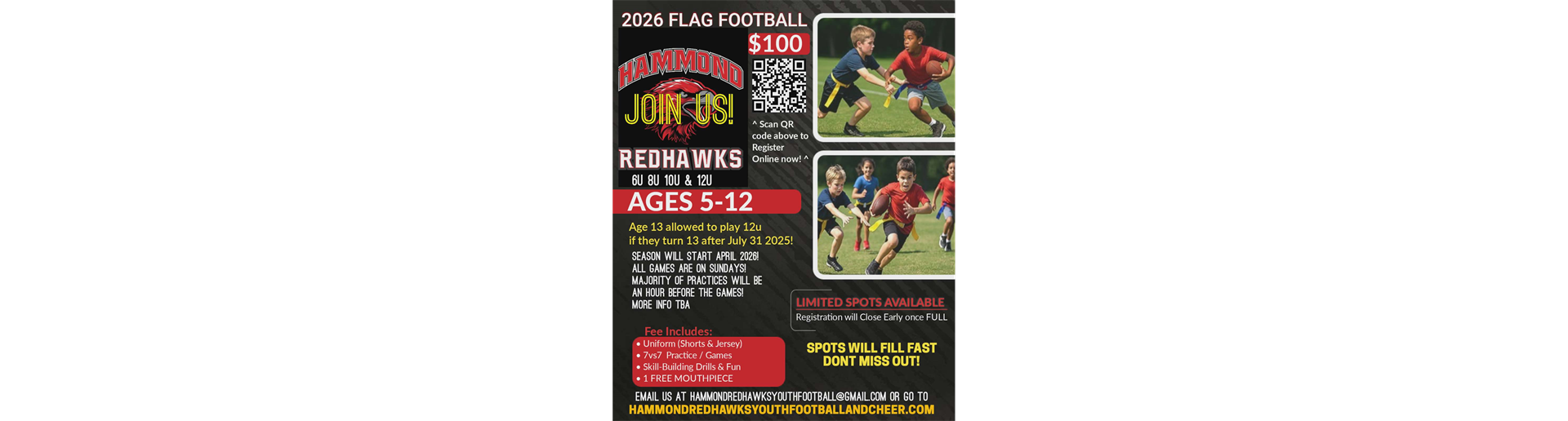 The Hammond RedHawks Youth Football and Cheer program is dedicated to providing a safe, fun, and competitive environment for children aged 5-13. Our program focuses on teaching the fundamentals of football and cheerleading, while also emphasizing the importance of teamwork, sportsmanship, and discipline.